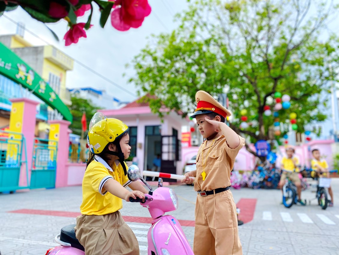 Tham gia trải nghiệm đầu tiên là các bé khối 5 tuổi. Với trẻ được tham gia trải nghiệm là một hoạt động vô cùng hứng thú. Ở sân chơi này trẻ hiểu được các phương tiện tham gia giao thông đường bộ. Đó không chỉ trên ti vi mà chính trẻ là chủ nhân của những chiếc xe máy, xe đạp, xe ô tô được tự mình tham gia giao thông đường bộ. Trẻ háo hức khi tự mình mang trên mình bộ áo quân phục của chú cảnh sát giao thông.
